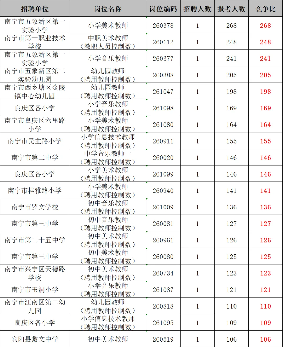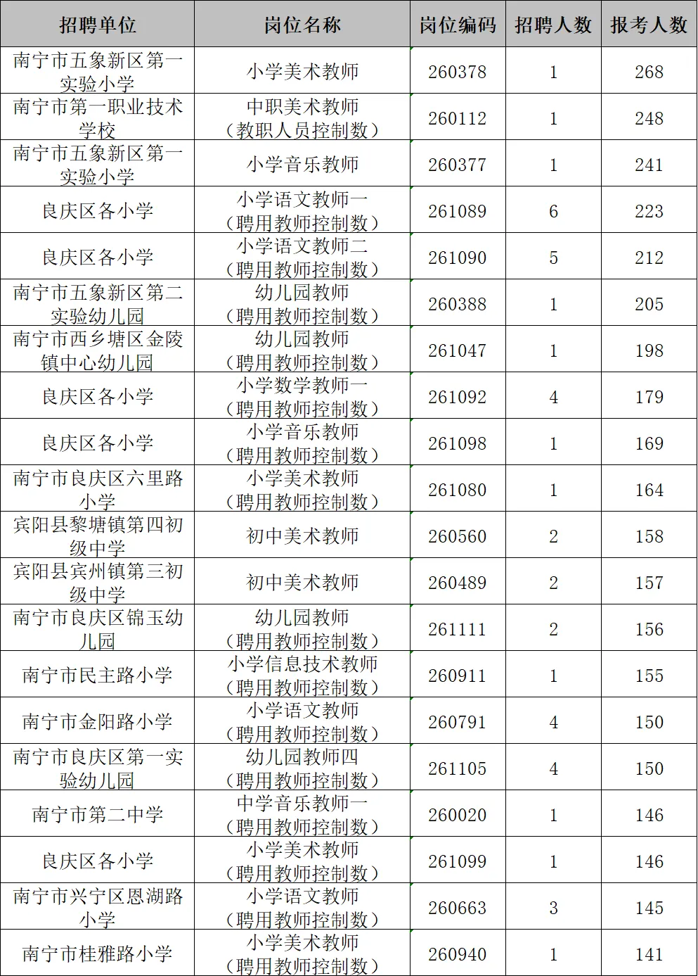 从岗位竞争情况看,目前竞争最激烈的岗位依然是南宁市五象新区第一实验小学-小学美术教师,该岗位招1人,已有268人报名。竞争比268:1