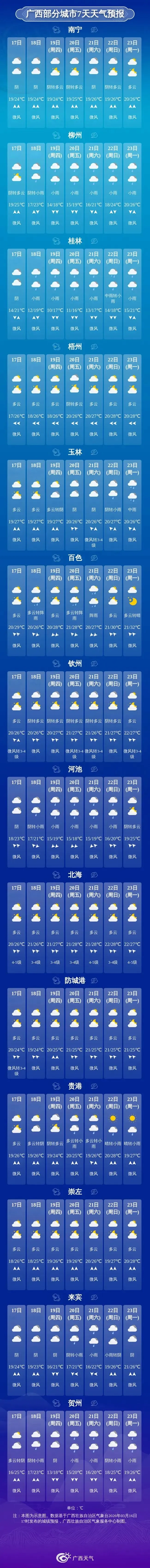 3月16日(昨日),广西各地气温呈现显著南北差异,桂南大部最高气温突破20℃,梧州龙圩以 27.9℃领跑全区,而桂东北局地气温仅10℃左右。17日,桂北桂西不仅要被阴雨缠上,还会刮起7~8级阵风。南宁主打阴天,偶有小雨,早晚温差大,“洋葱式穿衣法” 赶紧安排上。