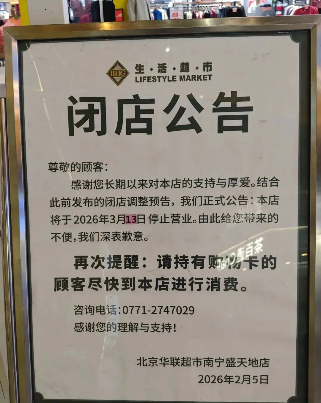 12日下午4时许,记者来到南宁市东盟盛天地购物中心B1层,在华联超市入口处看到一则2月5日发布的闭店公告,称该店将于2026年3月13日停止营业,提醒持有购物卡的顾客尽快到店进行消费。