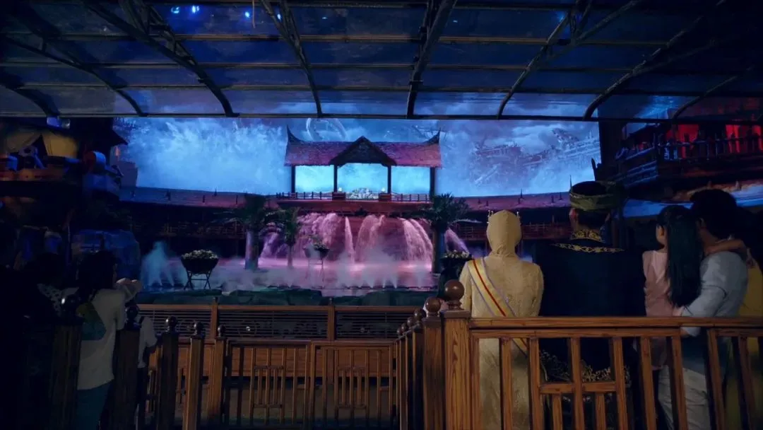 【走进吴哥】的右边是连接东西区文化走廊,前方就是印尼魔球幻影剧场【千岛之歌】。这个非常经典的大型真人歌舞表演,大家可不能错过哦!婀娜多姿的印尼歌舞与高科技程控球阵魔球表演相结合,缤纷绚丽、浪漫唯美,呈现出另一番梦幻的印尼风情。