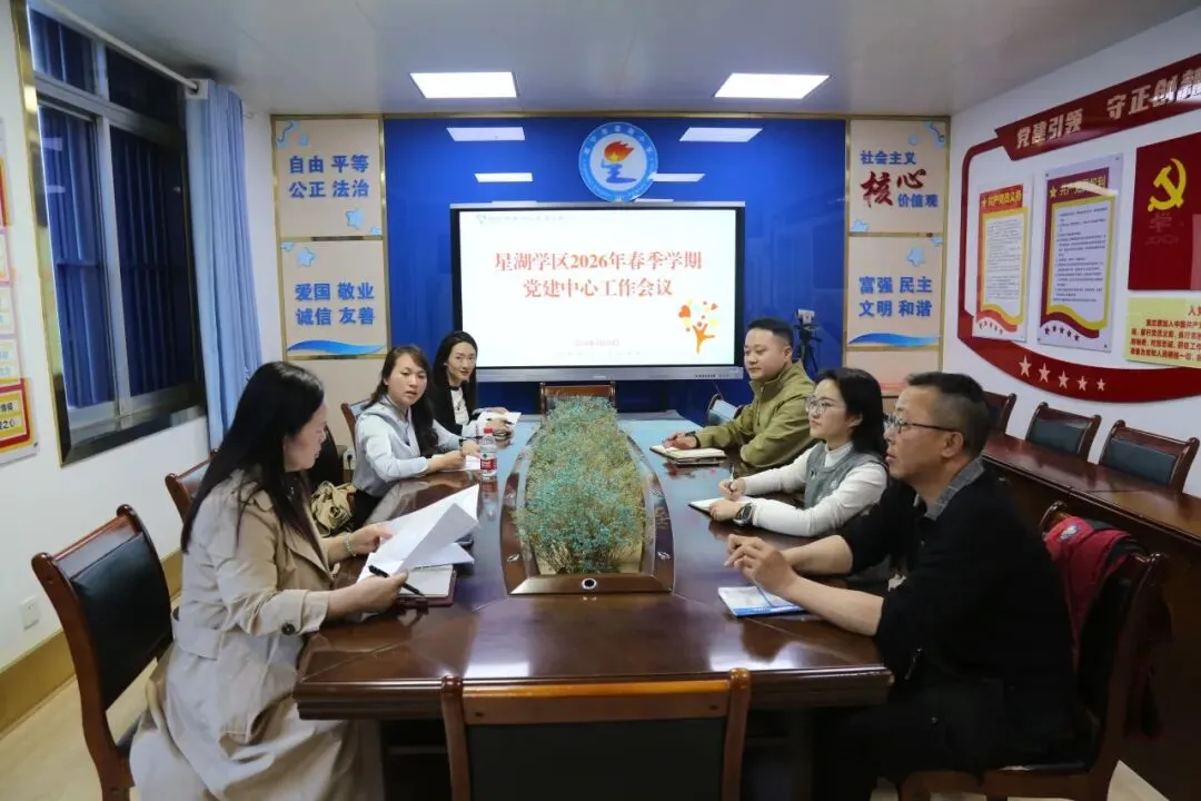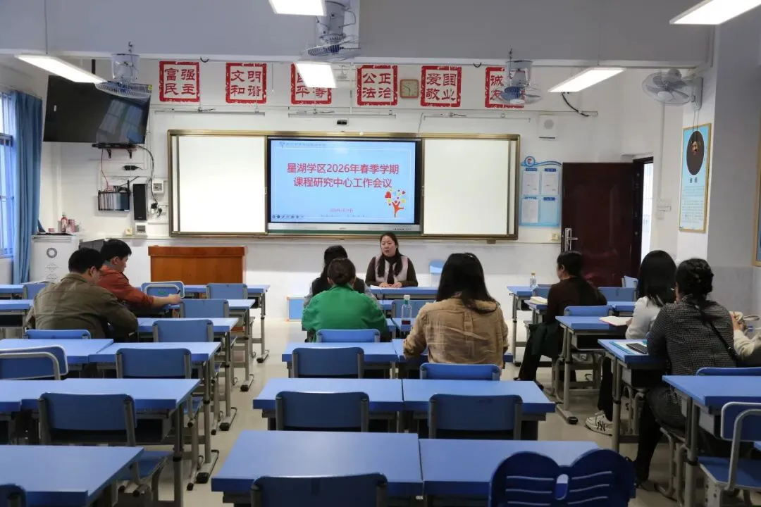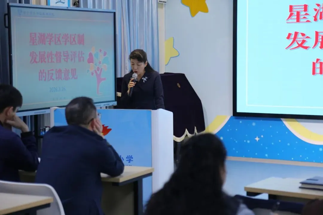 随后,学区长李若梅以《红帆引航启新程 赋能提质筑‘星’途》为主题,详细解读星湖学区 2026 年工作计划,明确 2026 年学区将以高质量党建为引领,深化五育融合、推进师资均衡、攻坚课程创新、筑牢后勤保障,同时以破解体育场地用房难题为试点,全力推进义务教育优质均衡发展迎国检工作,为学区新学期工作提供了清晰的“施工图” 和“任务书”。