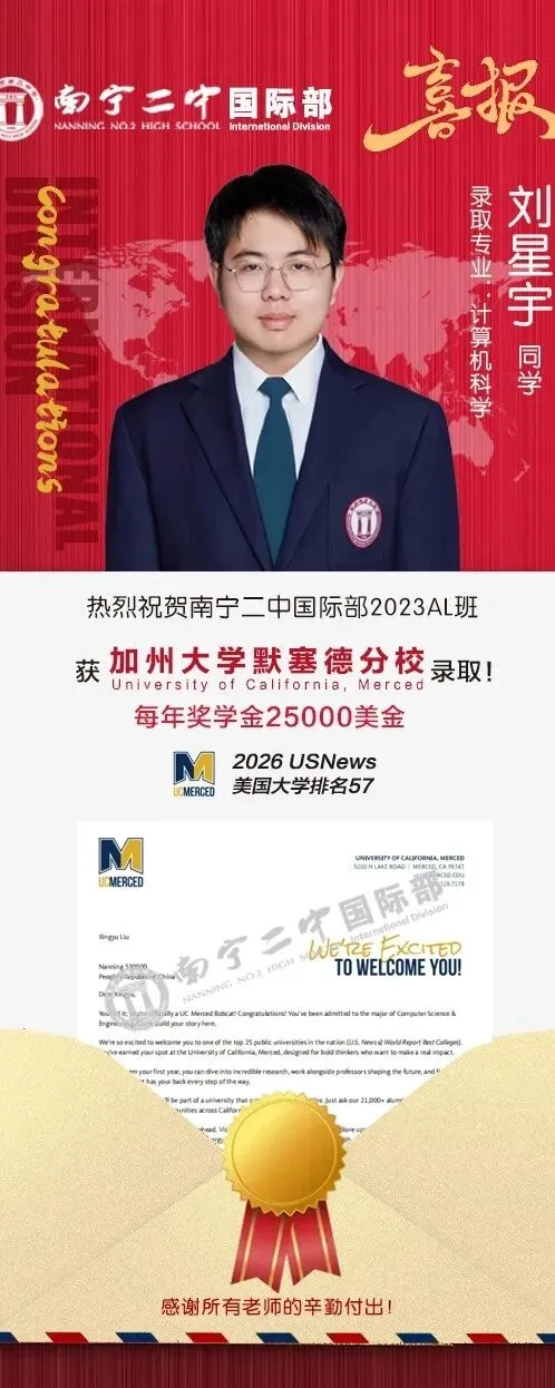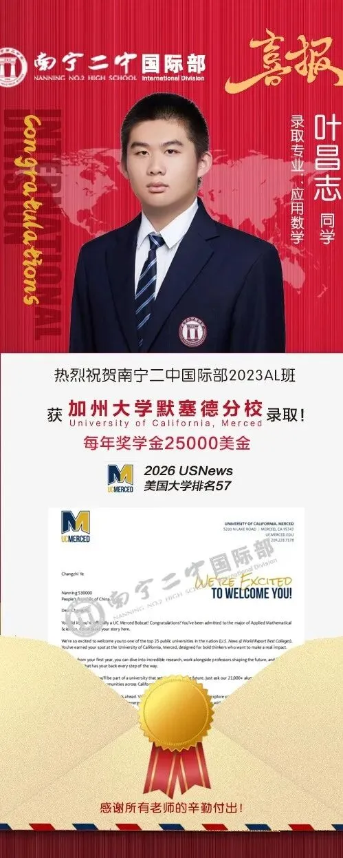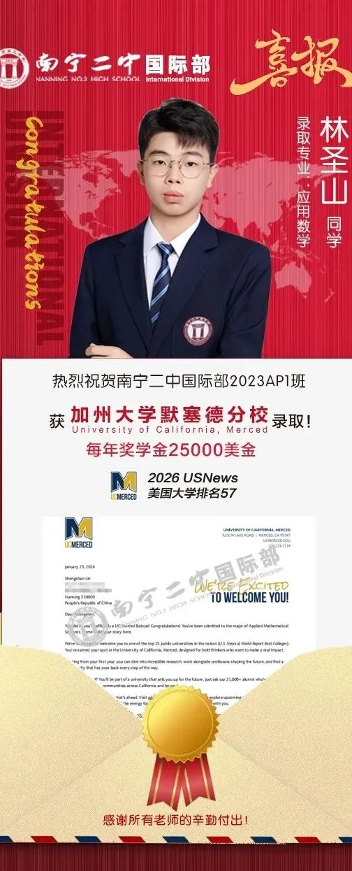 加州大学默塞德分校是加州大学系统最年轻的校区,2005 年正式开学,2026U.S. News 全美综合第 57 位、公立第 25 位,位于加州中央谷地区。学校以创新、可持续与跨学科研究为特色,聚焦工程、计算机、环境科学、生命科学、社会科学等领域,在可持续能源、气候变化、数据科学等方向快速崛起,科研潜力巨大。