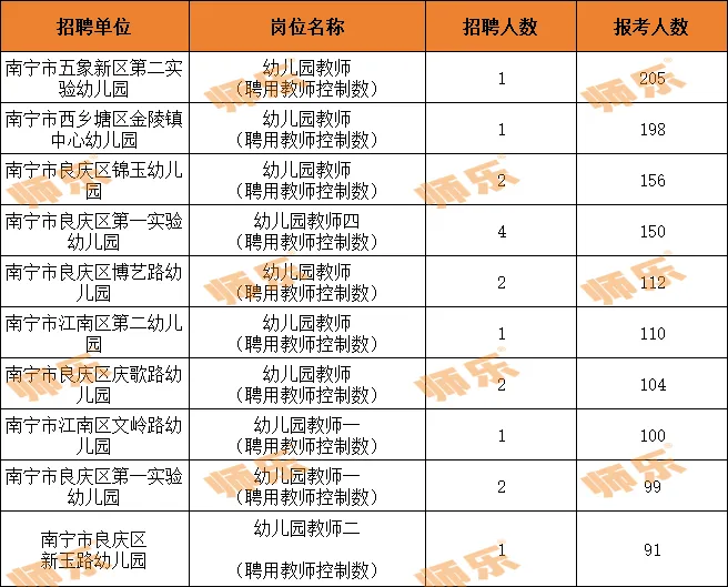 ①南宁市五象新区第二实验幼儿园,幼儿园教师(聘用教师控制数),招1人,当前报考人数205人;