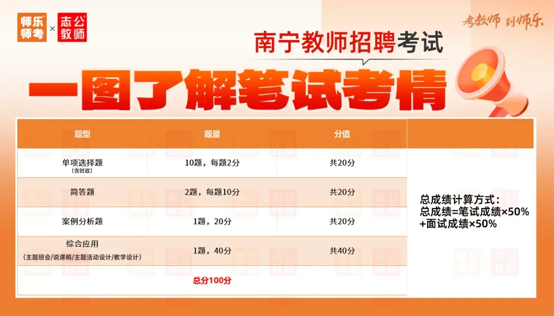 学习综合应用能力D类+两学知识,增加学科专业知识并关注教育时政内容。南宁教招笔试成绩计入总成绩,并且占比高达50%,笔试很重要!