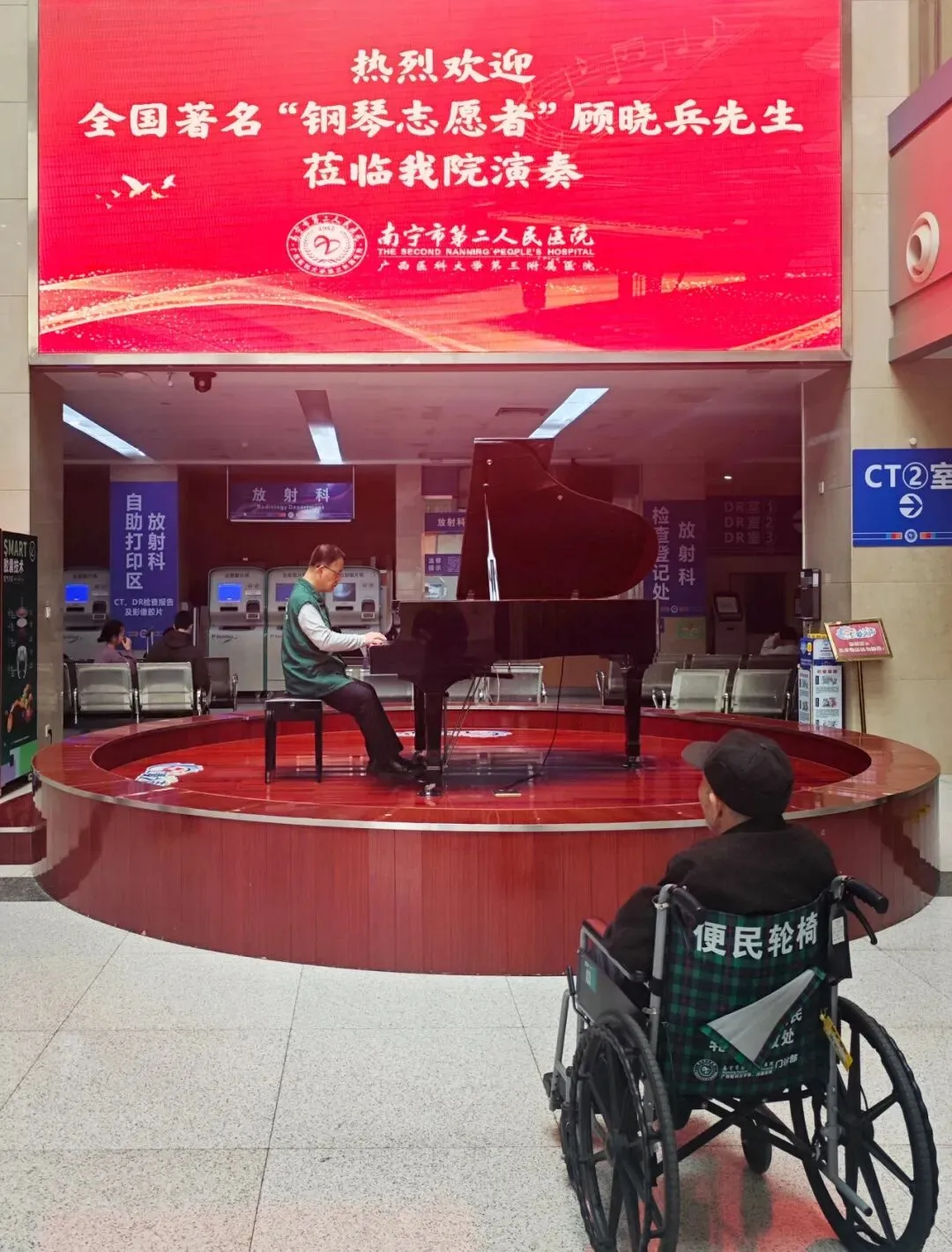 顾晓兵来自浙江舟山,是全国著名的钢琴志愿者,他热爱钢琴演奏,心怀公益热忱,经常奔赴全国各地医疗机构进行义演。2018年首次来院义演后,他被医院仁爱志愿文化所打动,近期主动联系医院社工部希望再次为南宁市第二人民医院的患者、职工服务,用指尖旋律传递爱心,用音乐为就医环境增添温情与暖意。