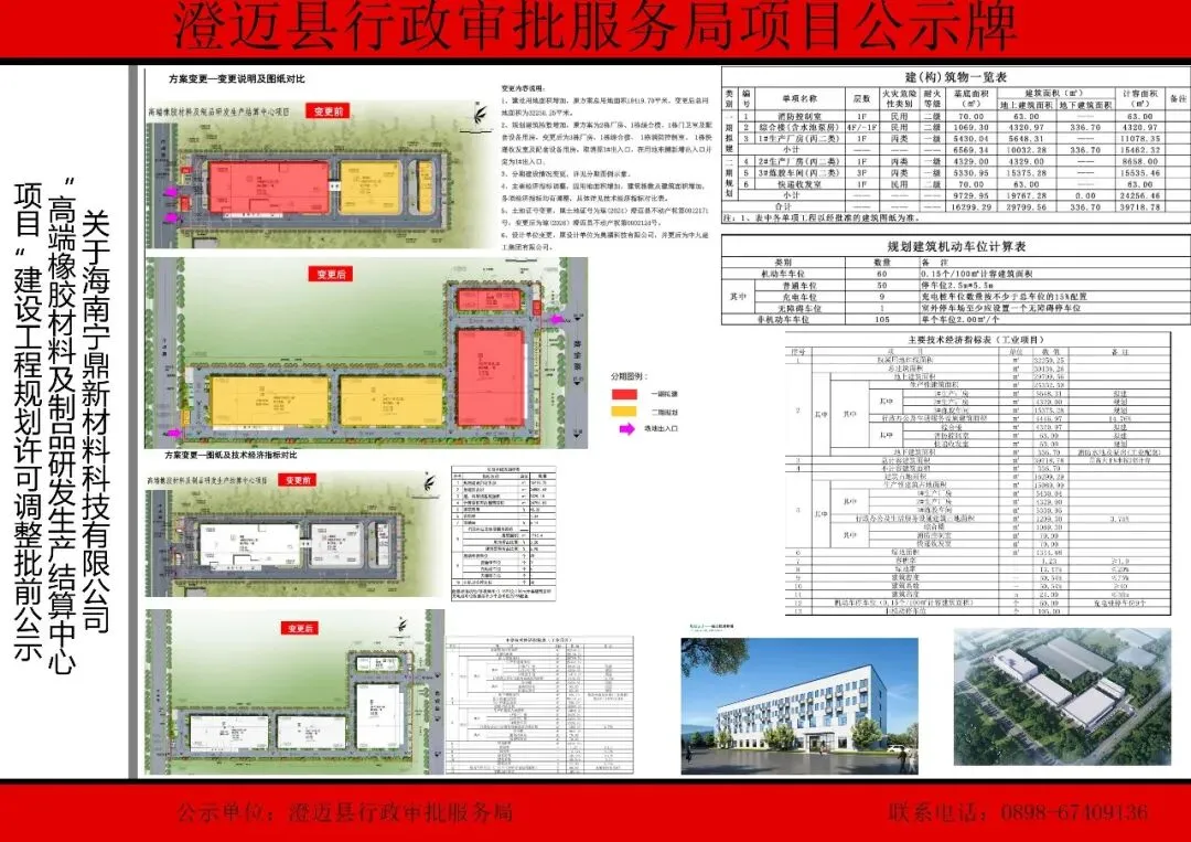 海南宁鼎新材料科技有限公司建设的“高端橡胶材料及制品研发生产结算中心项目”位于海南老城科技新城物流纵六路和物流金一路交汇处西北侧,不动产权证为琼(2026)澄迈县不动产权第0002124号,证载用地面积32250.25㎡,土地用途为工业用地。该项目于2024年11月14日取得建设工程规划许可证,2025年2月5日完成规划变更,变更后总经济技术指标为:规划用地面积18419.7㎡,总建筑面积24806.63㎡,总计容面积24751.83㎡,地上建筑面积24614.63㎡,地下建筑面积192㎡,容积率1.34,建筑密度45.2%,绿地率为8.14%,机动车停车位38个,非机动车停车位38个。本次拟建经济技术指标为:总建筑面积15691.94㎡,总计容面积15637.14㎡,地上建筑面积15499.94㎡,地下建筑面积192㎡。一、土地证变更,由琼(2024)澄迈县不动产权第0012171号变更为琼(2026)澄迈县不动产权第0002124号;证载用地面积由18419.7㎡变更为32250.25㎡。三、取消原批1#炼胶车间、传达室、消防水池及水泵房、2#炼胶车间、综合楼;变更为1#生产厂房、2#生产厂房、3#炼胶车间、综合楼、消防控制室、快递收发室。五、设计单位由奥福科技有限公司青岛分公司变更为中九建工集团有限公司。其中,拟建一栋综合楼,总建筑面积4657.67㎡,计容面积4320.97㎡,不计容面积336.7㎡,地上建筑面积4320.97㎡,地下建筑面积336.7㎡。拟建一栋1#生产厂房,总建筑面积5648.31㎡,计容面积11078.35㎡,地上建筑面积5648.31㎡。拟建一栋消防控制室,总建筑面积63㎡,计容面积63㎡,地上建筑面积63㎡。规划一栋2#生产厂房总建筑面积4329㎡,计容面积8658㎡,地上建筑面积4329㎡。规划一栋3#炼胶车间总建筑面积15375.28㎡,计容面积15535.46㎡,地上建筑面积15375.28㎡。规划一栋快递收发室总建筑面积63㎡,计容面积63㎡,地上建筑面积63㎡。调整后总经济技术指标为:规划用地面积32250.25㎡,总建筑面积30136.26㎡,总计容面积39718.78㎡,总不计容面积336.7㎡,地上建筑面积29799.56㎡,地下建筑面积336.7㎡,容积率1.23,建筑密度50.54%,绿地率为13.47%,机动车停车位60个,非机动车停车位105个。本次拟建经济技术指标为:总建筑面积10368.98㎡,总计容面积15462.32㎡,总不计容面积336.7㎡,地上建筑面积10032.28㎡,地下建筑面积336.7㎡。根据住建部《关于城乡规划公开公示的规定》第十八条规定,为广泛征求相关权益人的意见,现按程序进行规划许可调整批前公示。公示时间:7个自然日(2026年3月17日至2026年3月23日);公示地点:澄迈县政务服务大厅公示栏、澄迈营商环境公众号、项目建设现场公示牌、澄迈县政府网站(http://www.chengmai.hainan.gov.cn)。意见或建议应在公示时间内提出,逾期未提出,将视为无意见。为确保意见或建议真实有效,以便我局及时反馈情况,请提供真实姓名和联系方式。公示单位联系方式:澄迈县行政审批服务局(联系电话:0898-67409136);邮箱:cmxzspj@163.com;邮寄地址:澄迈县金江镇金马大道地经六路3号;邮编:571900。附件:公示图