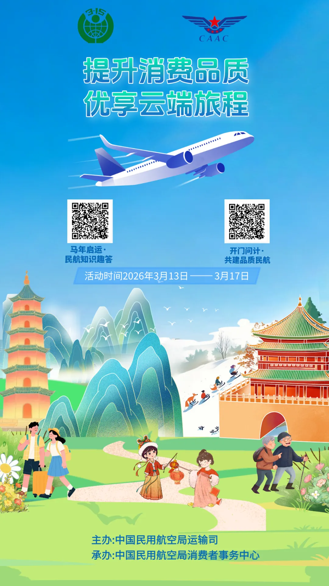 民航局 “马年启运・民航知识趣答”“开门问计・共建品质民航” 线上活动将持续至 3月17日,旅客可通过扫描二维码参与答题、建言献策,赢取精美礼品。