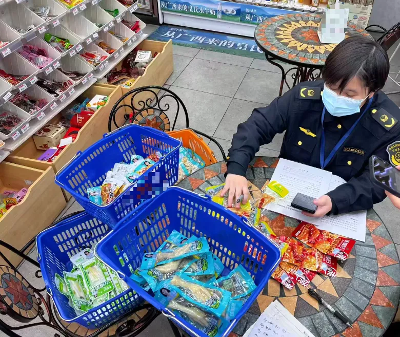 930记者把相关问题反映给12315部门后,南宁市市场监管部门执法人员立即开展排查工作,在某便利店现场发现与“3·15”曝光问题相符的鸡爪产品35包,均已当场要求下架处理。