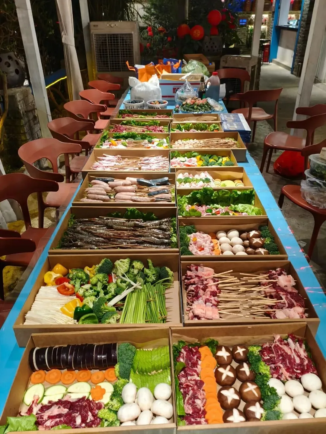 附菜单:五花肉、排骨、扁菜、黄瓜、茄子、瘦牛、掌中宝、热狗、肥牛、小鸡腿、豆腐皮、烤鱼、玉米、汤粉、花生、鸡中翅、生蚝、虾、鱿鱼、粥、瓜子、水果、王老吉、矿泉水等