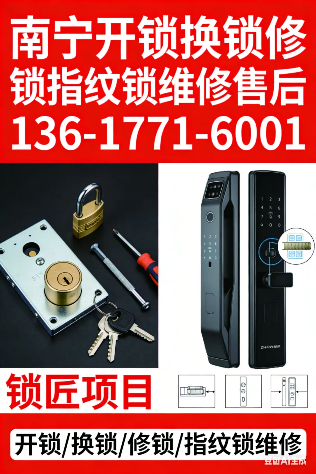 点击一键拨号:136-1771-6001在南宁青秀区,无论是居家、商铺还是办公场所,难免会遇到开锁修锁的紧急难题——钥匙丢失、门锁卡死、指纹锁失灵、门禁打不开,甚至汽车钥匙锁在车内,每一种情况都让人焦头烂额,既耽误时间,又暗藏安全隐患。找未经备案的“黑锁匠”怕不安全、乱收费,自己动手又毫无头绪?今天,我们为南宁青秀区全路段用户,带来专业开锁修锁售后一站式服务,覆盖竹溪大道附近开锁、朗西开锁、东盟商务区开锁等核心路段,兼顾指纹锁开锁、玻璃门锁开锁、门禁开锁、汽车开锁等全品类需求,专业备案师傅上门,明码标价、售后有保障,一个电话就能解决所有开锁难题!