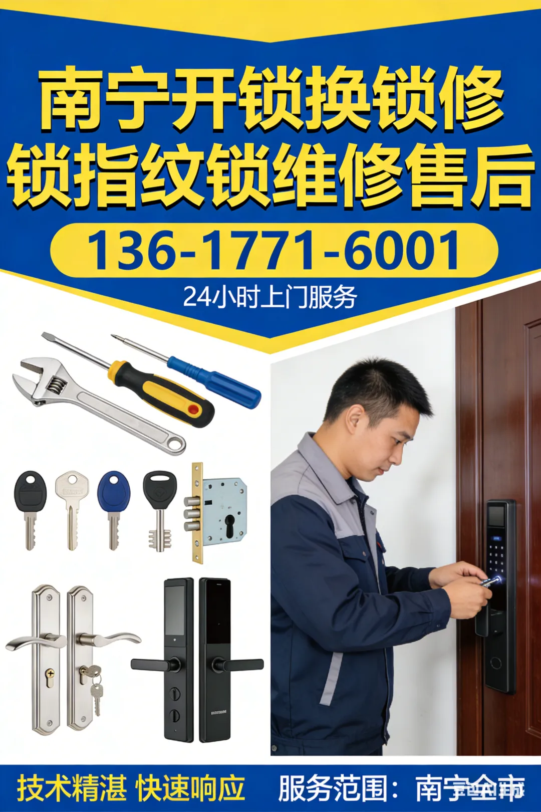 24小时应急售后:无论白天黑夜、节假日,只要在青秀区范围内(竹溪大道、朗西、东盟商务区等所有路段),遇到紧急开锁难题,拨打 136-1771-6001,随时响应,优先安排师傅上门;