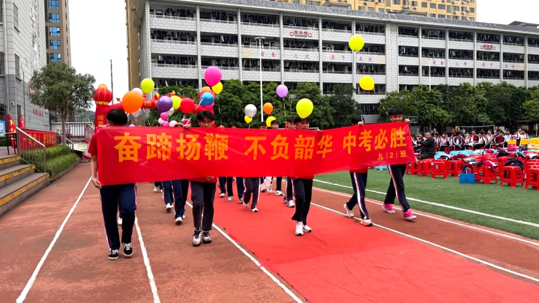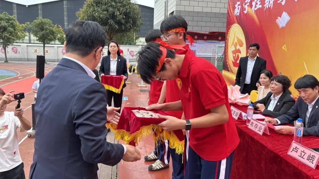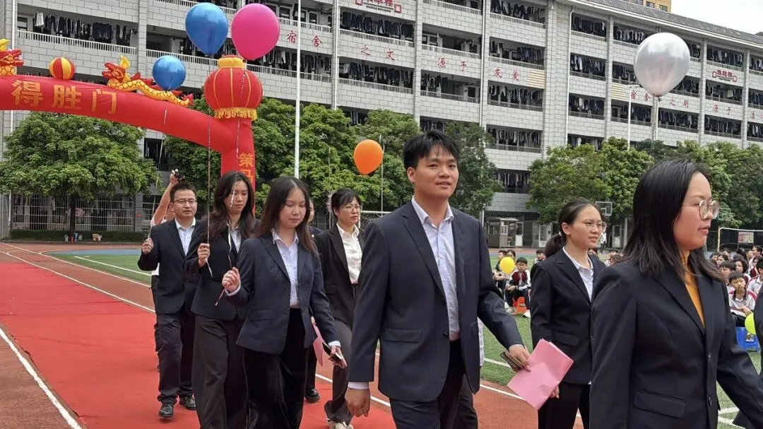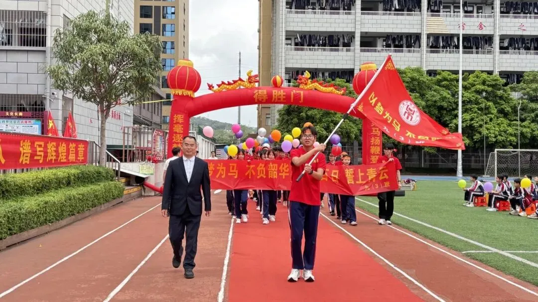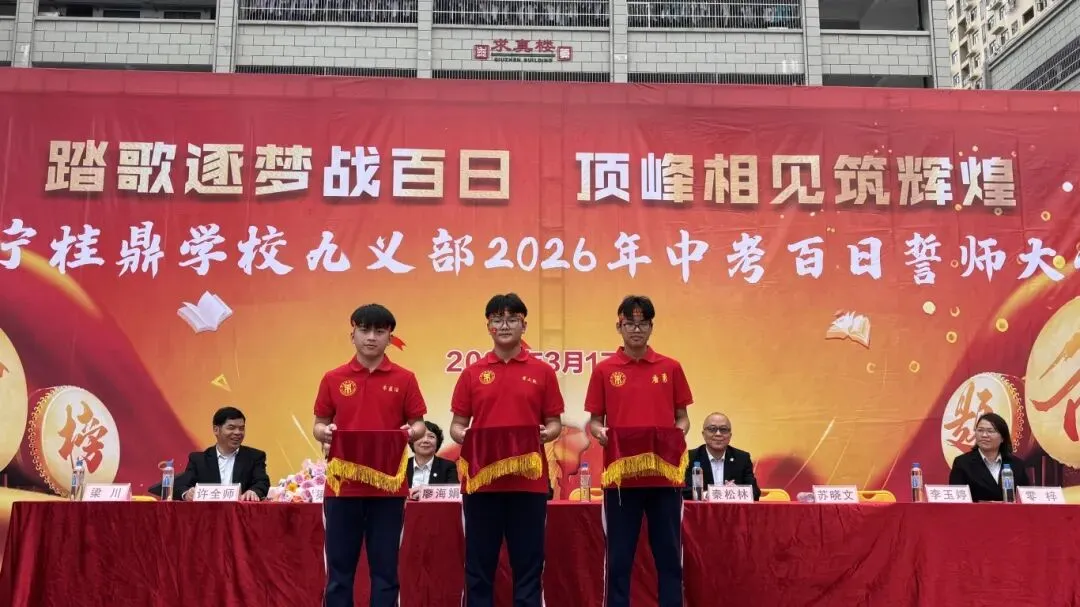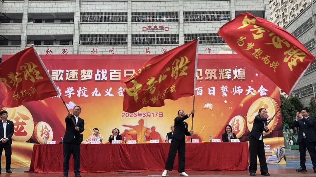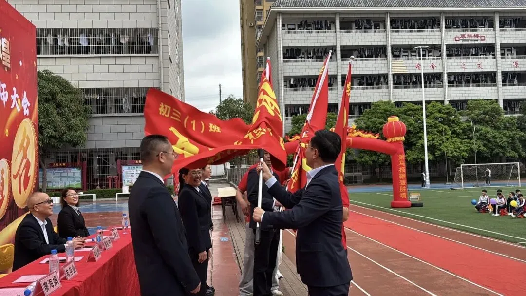 随后,卢校长将象征着胜利与使命的“中考必胜”大旗,郑重授予九年级的三位班主任。红旗挥舞,斗志昂扬,寓意着中考征程正式进入全力冲刺阶段。
