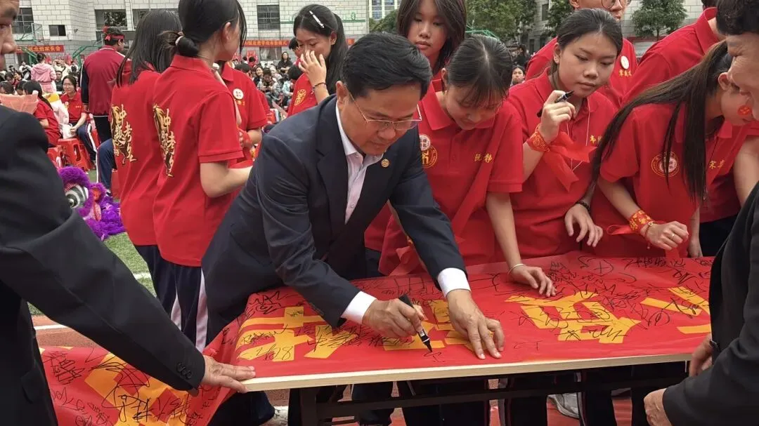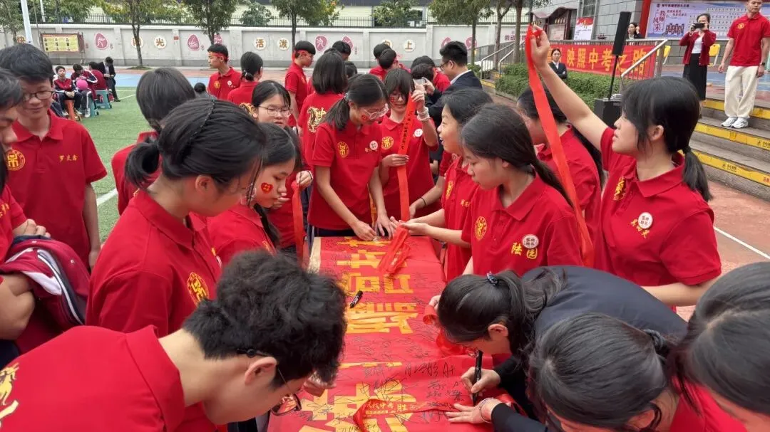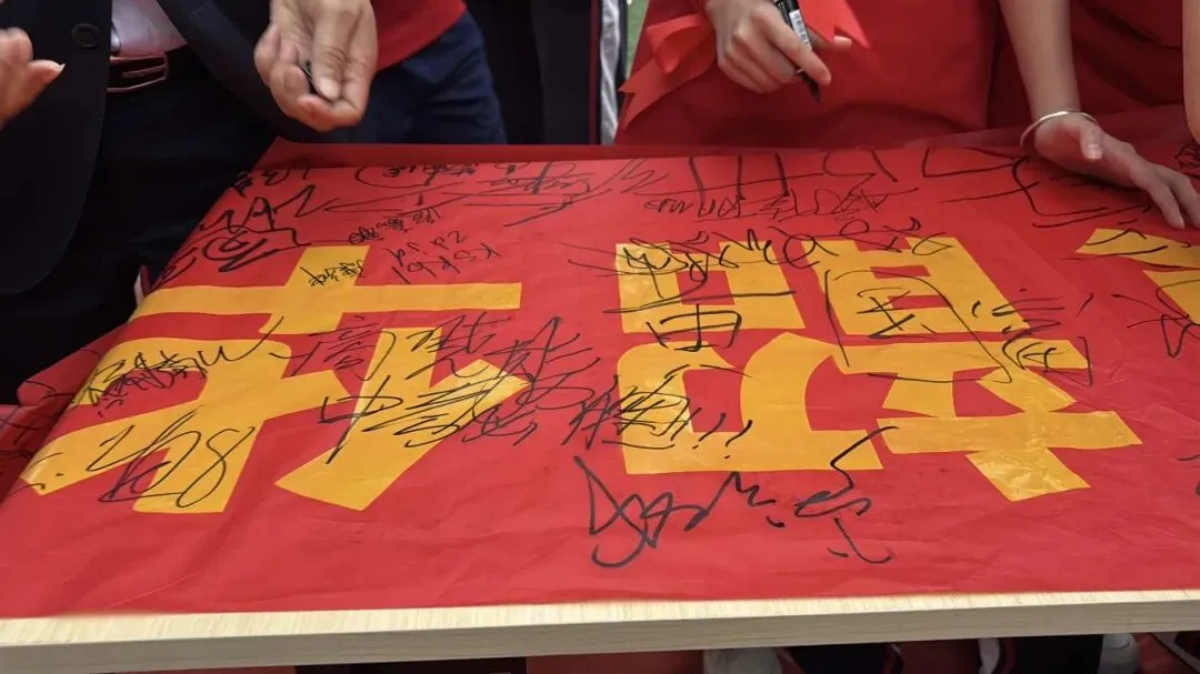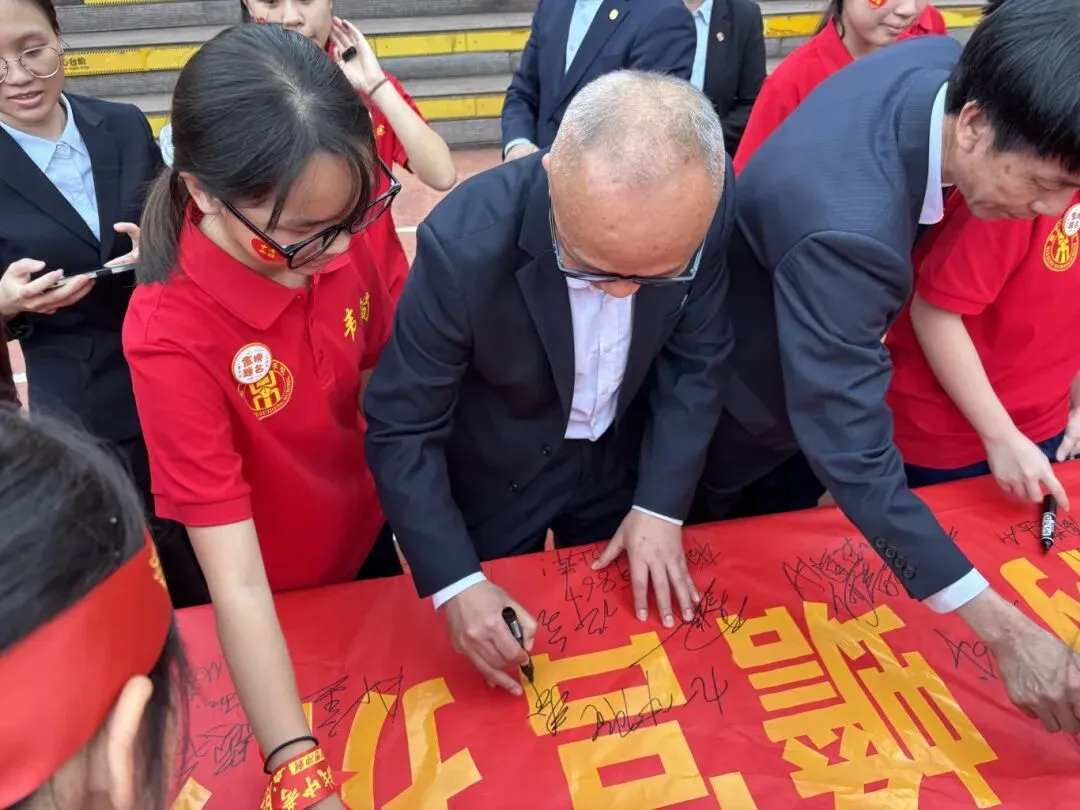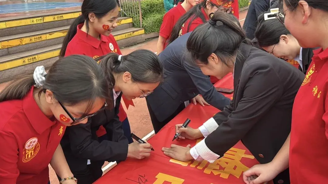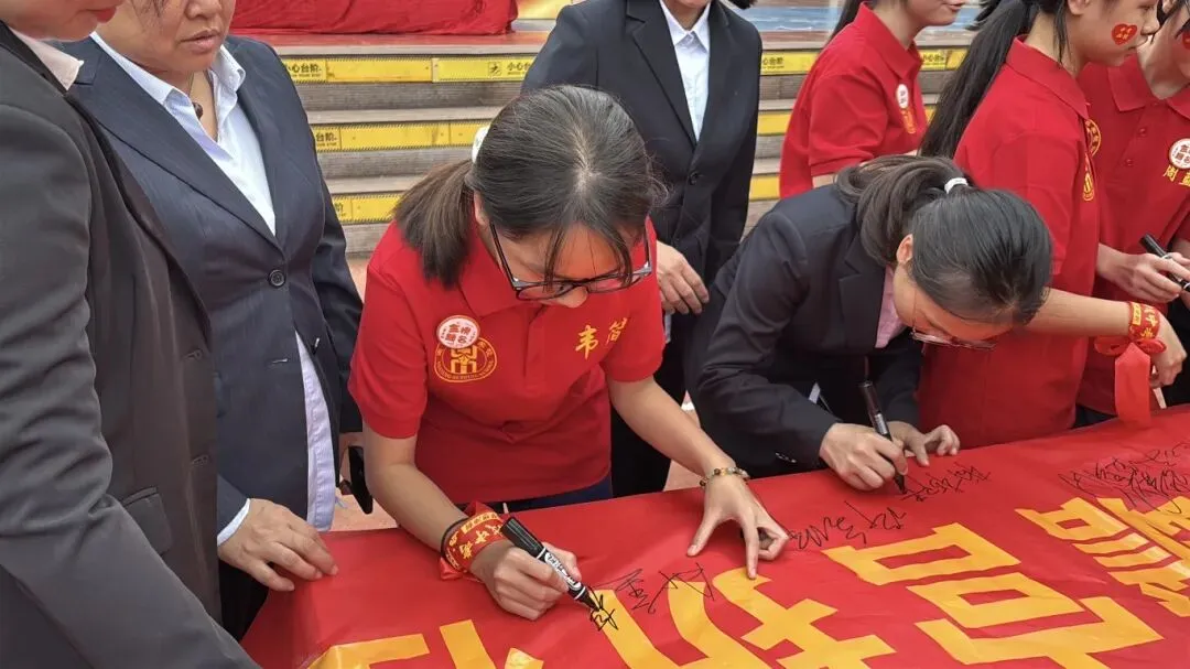 最后,与会领导、师生纷纷在励志横幅上郑重签下自己的名字,许下对百日后辉煌的庄严承诺。大会在充满欢声笑语的“抢零食”互动环节中圆满落下帷幕。
