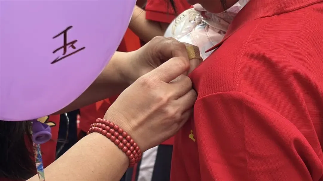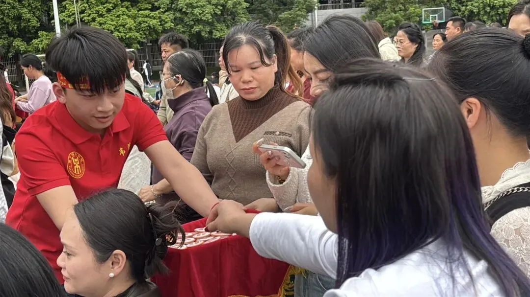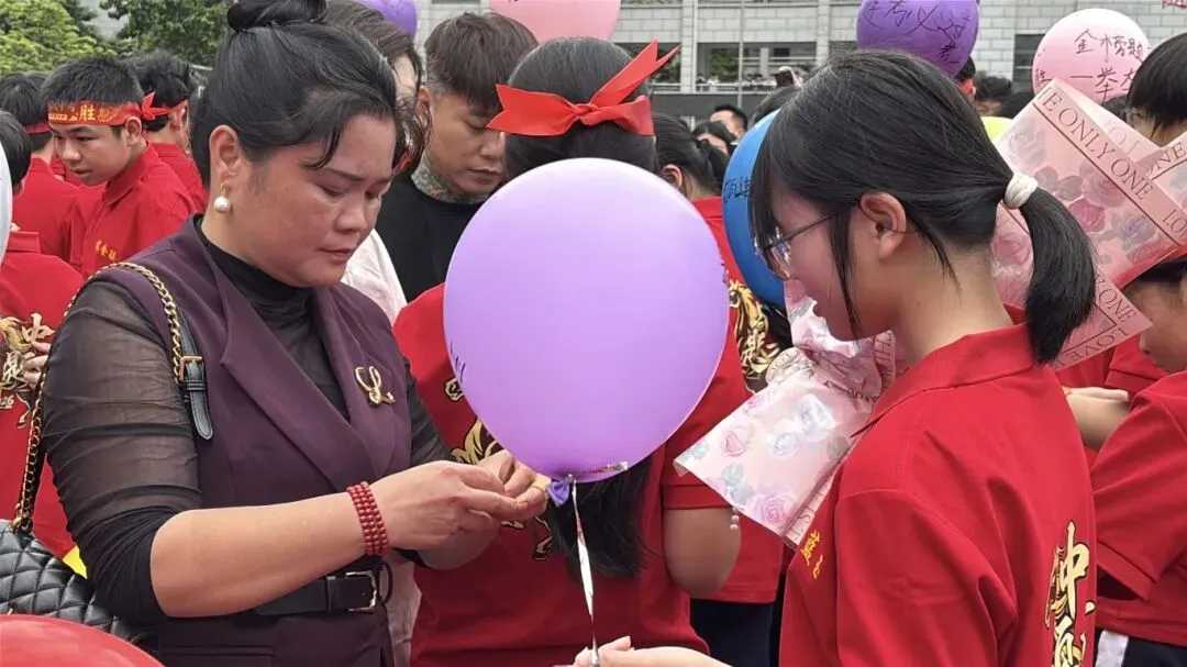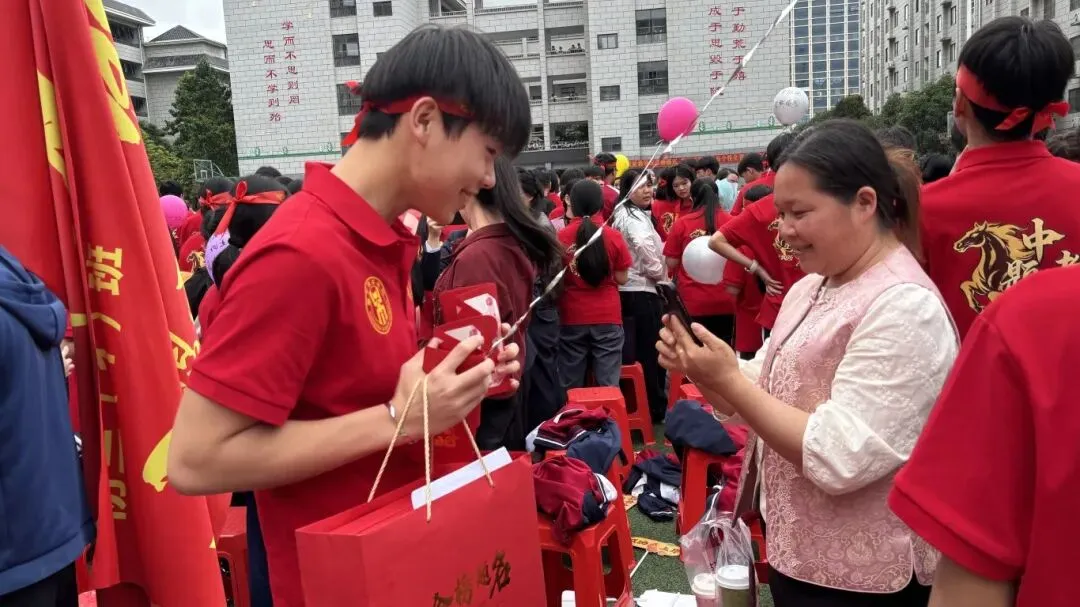 在温情的互动环节,卢校长将精心准备的“金榜题名”徽章递到九年级各班班长手中。由班长传递到家长手中后,家长们亲手为自己的孩子佩戴上这枚承载着祝福与期许的徽章,并送上准备好的礼物。这一刻,拥抱与鼓励化为无言的爱与力量。