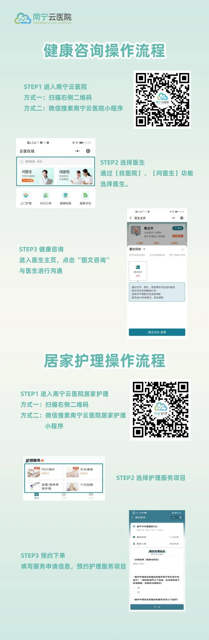 目前,南宁市第一人民医院、南宁市第二人民医院、南宁市第三人民医院、南宁市第四人民医院、南宁市第五人民医院、南宁市第六人民医院、南宁市第七人民医院、南宁市第八人民医院、南宁市第九人民医院、南宁市中医医院、南宁市妇幼保健院、南宁市第二妇幼保健院、南宁市红十字会医院共13家公立医院已入驻平台,内科、外科、妇科、儿科等多个科室的医生提供专业线上健康咨询服务;专业护士提供静脉采血、血糖测量、糖尿病足等上门护理服务项目。