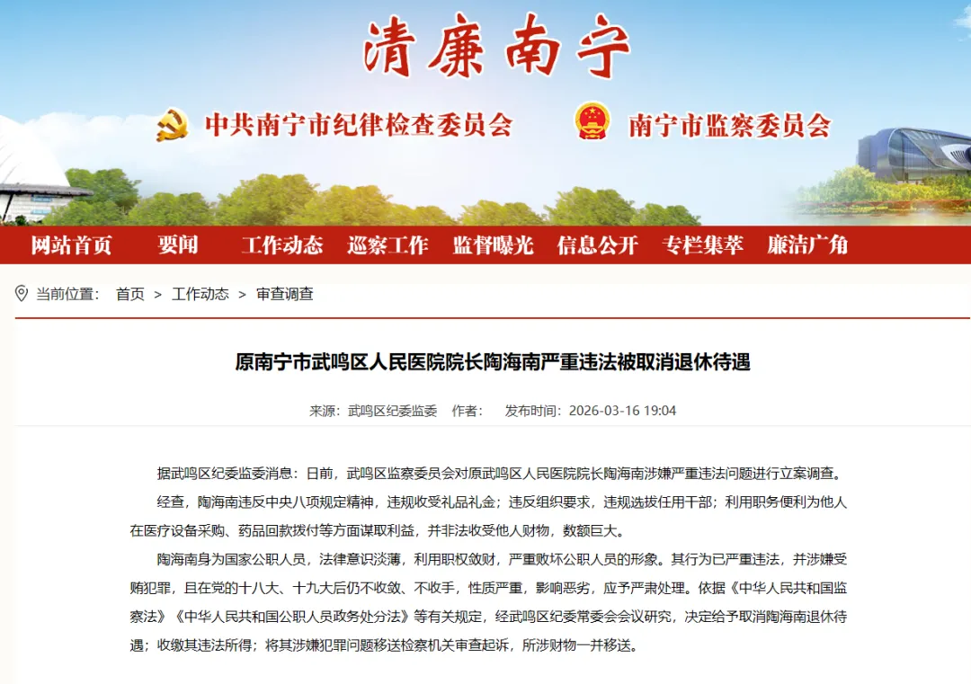 据武鸣区纪委监委消息:日前,武鸣区监察委员会对原武鸣区人民医院院长陶海南涉嫌严重违法问题进行立案调查。