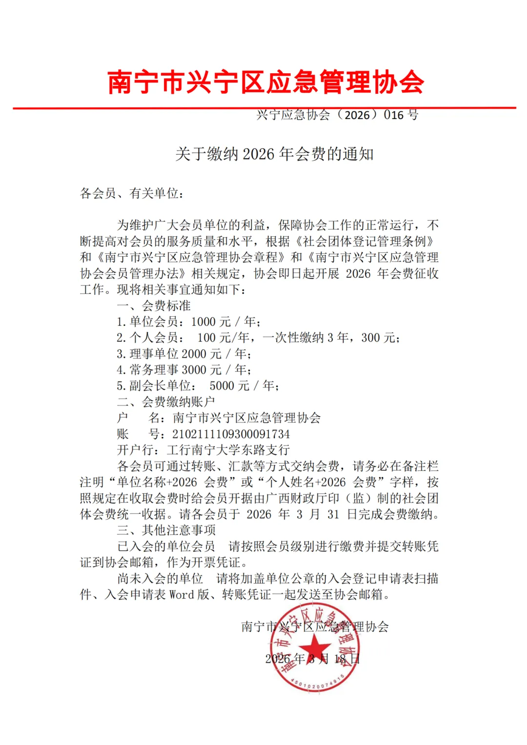 南宁市兴宁区应急管理协会关于征收2026年会费的通知
