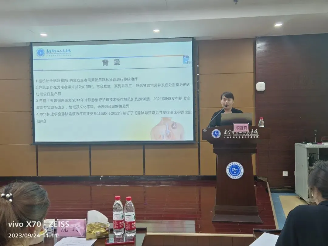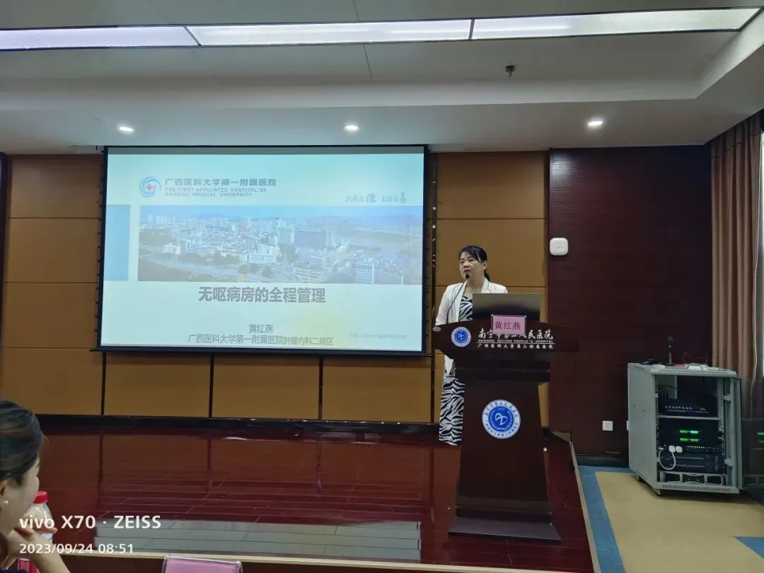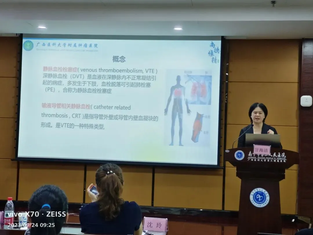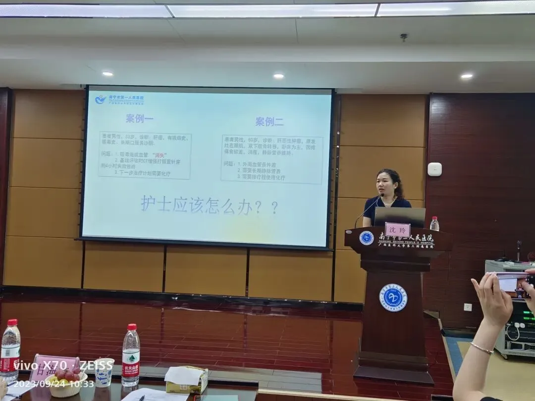 肿瘤护理培训环节,广西医科大学第一附属医院黄红燕教授、广西医科大学附属肿瘤医院甘海洁教授、南宁市第一人民医院沈玲教授、南宁市第二人民医院邓丽莉教授分别就无呕病房全程管理、导管相关性血栓的预防与护理、PICC在肿瘤患者中的应用、静脉导管并发症临床护理实践指南解读进行了精彩授课。