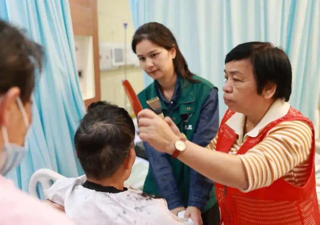 活动中,医院志愿者们来到病房,了解患者病情,鼓励他们保持乐观心态,积极配合治疗,早日康复,传达来自医院的关心关怀。莫丽英爱心团队志愿者们带着专业的理发工具,细心地为60多名住院患者进行义诊。他们一边理发,一边与患者亲切交谈,询问他们的身体状况和需求,理发师们精湛的手艺和志愿者们温馨的话语,让患者们感受到了家一般的温暖。许多患者表示,由于长期住院,理发成了他们的一大难题,而这次爱心义剪活动正好解决了他们的燃眉之急,让他们感到非常感动和温暖。