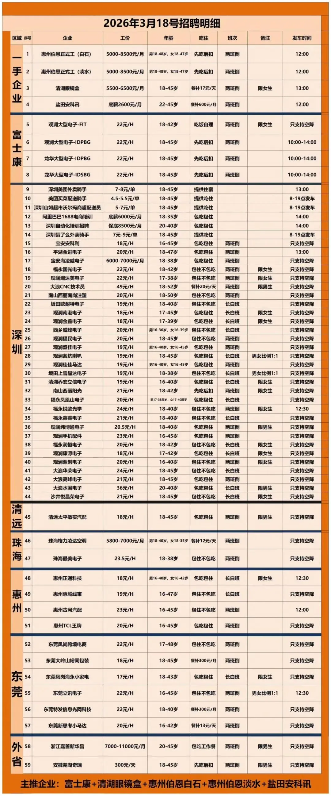 【食宿情况】免费工作餐,免费住宿,水平平摊,内设空调、热水器、洗衣机。【招聘要求】:男女不限,18-45岁(男40)