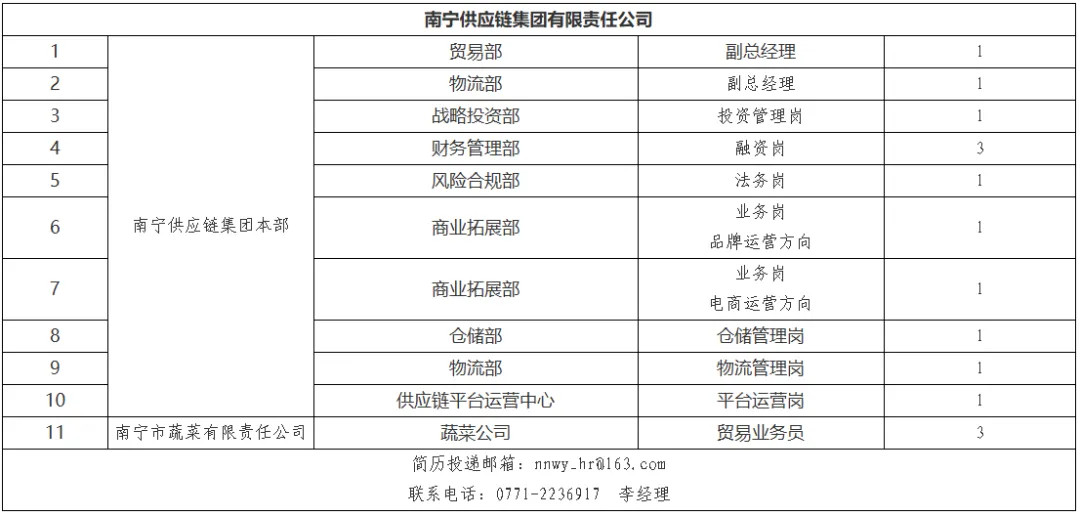 本次招聘采取网上报名方式,报名截止时间为2026年3月20日,请尽快投递。具体岗位要求、简历投递邮箱、联系电话详见附件1,符合条件的人选请下载《南宁供应链集团应聘登记表》(附件2)填写发送相应邮箱,邮件主题及应聘登记表命名为“应聘公司+岗位名称+姓名”,并选择邮件回执。未尽事宜请联系李经理,联系电话:0771-2236917(工作日08:00-12:00,15:00-18:00)。每位应聘者仅能选择一个职位投递简历,请勿重复投递。