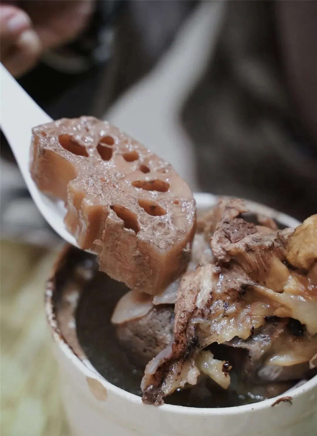 没有复杂的调味,没有多余的添加,只有食材本身的味道。筒骨的肉香,莲藕的清甜,在慢火炖煮中慢慢融合,形成了这碗琥珀色的汤。