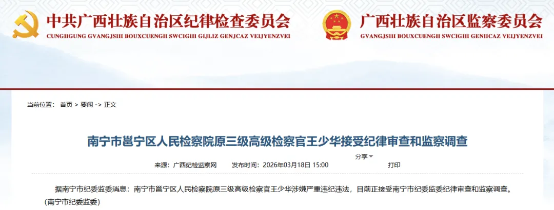 据南宁市纪委监委消息:南宁市邕宁区人民检察院原三级高级检察官王少华涉嫌严重违纪违法,目前正接受南宁市纪委监委纪律审查和监察调查。