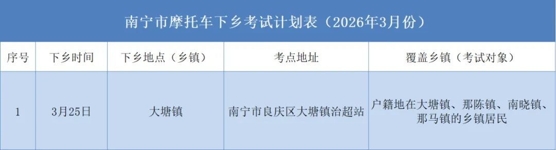 摩托车驾驶人考试下乡服务时间原则上按以上计划实行,若遇不可抗力因素,极端恶劣天气或报名人数达不到开考条件(30人)等,南宁交警将调整部分计划并及时公告。