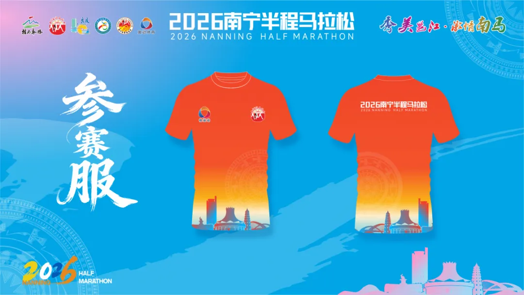 赛事周边设计同样融合城市特色与非遗文化,兼具颜值与纪念意义。赛事奖牌正面以2026南宁半程马拉松赛事信息为基础,流沙内核居于视觉中心,四周环绕南宁市花朱槿花造型,背面萃取壮锦、铜鼓、绣球等广西经典非遗符号。参赛服装采用橙黄渐变为主色调,象征朝阳与活力,正面与背面均融入南宁地标剪影与铜鼓纹样,让每一位参赛者化身流动的城市风景。