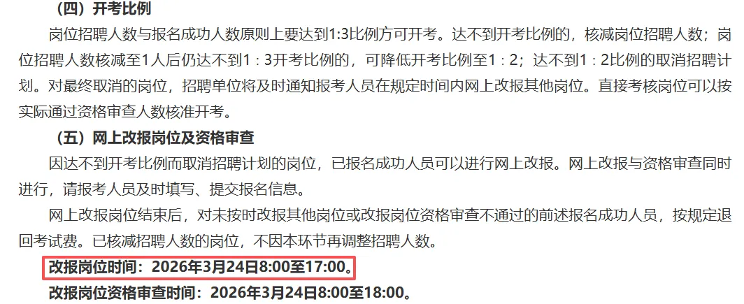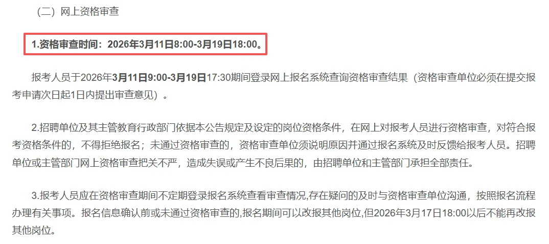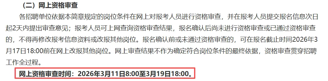 各招聘单位依据本简章规定的岗位条件在网上对报考人员进行资格审查,并在报考人员提交报名信息次日起2天内提出审查意见;报考人员可上网查询资格审查结果,报名确认后尚未进行资格审查或已通过资格审查的,不得再修改报考信息资料或改报其他岗位。报名确认前或未通过资格审查的,可在报名截止时间2026年3月17日18:00前在网上改报其他岗位。网上审查结果不作为确定符合岗位条件的最终依据,资格审查贯穿招聘工作全过程。