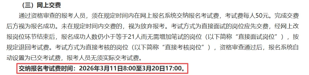南宁:通过资格审查的报考人员,须在规定时间内在网上报名系统交纳报名考试费,考试费每人50元。完成交费后方视为报名成功。未在规定时间内交费的,视为放弃报考。考试方式为直接面试的岗位应先交费,经网上改报岗位环节结束后,报名成功人数仍小于等于21人而无需增加笔试的岗位(以下简称“直接面试岗位”),按规定退回考试费。考试方式为直接考核的岗位(以下简称“直接考核岗位”),资格审查通过后,报名系统自动设置为已交考试费,报考人员无须实际交考试费。