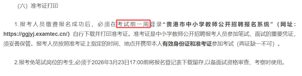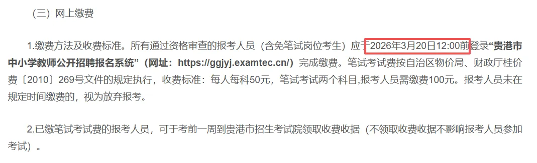 贵港:所有通过资格审查的报考人员(含免笔试岗位考生)应于2026年3月20日12:00前登录“贵港市中小学教师公开招聘报名系统”(网址:https://ggjyj.examtec.cn/)完成缴费。笔试考试费按自治区物价局、财政厅桂价费〔2010〕269号文件的规定执行,收费标准:每人每科50元,笔试考试两个科目,报考人员需缴费100元。报考人员未在规定时间缴费的,视为放弃报考。