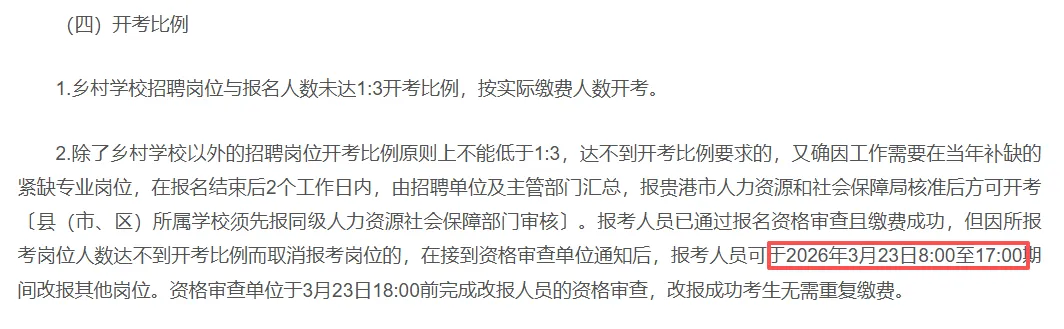 贵港市教师招聘网上缴费时间:2026年3月20日12:00前。