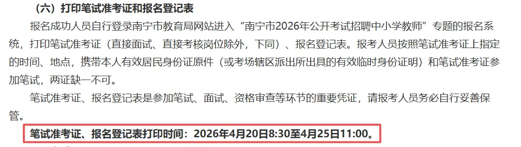 南宁笔试准考证、报名登记表打印时间:2026年4月20日8:30至4月25日11:00
