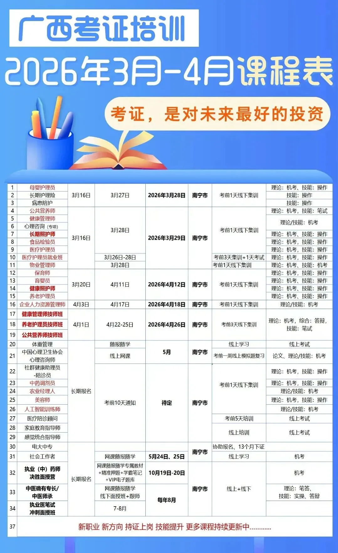 (2)分为高等职业学校和普通高校本科两类高等职业学校专业: 护理、康复治疗技术、健康管理、中医养生保健、康复辅助器具技术、假肢与矫形器技术、社会福利事业管理、公共事务管理、劳动与社会保障普通高校本科专业: 护理学、康复治疗学、临床医学、社会学、社会工作、公共事业管理、心理学等。