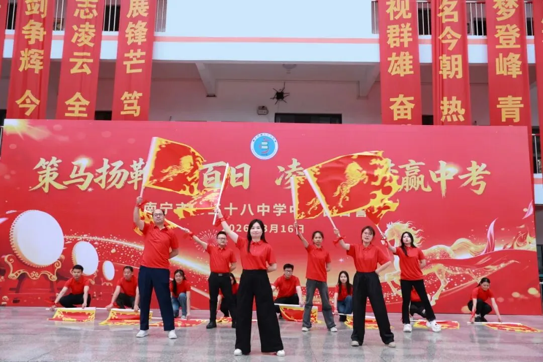 春潮涌动启新程,百日鏖战铸辉煌。3月16日上午,南宁市第三十八中学教学楼前广场旌旗猎猎、气氛热烈,初中部全体师生齐聚一堂,隆重举行2026届中考百日誓师大会,以昂扬之姿迎接中考百日冲刺的号角,共同吹响逐梦中考的奋进乐章。