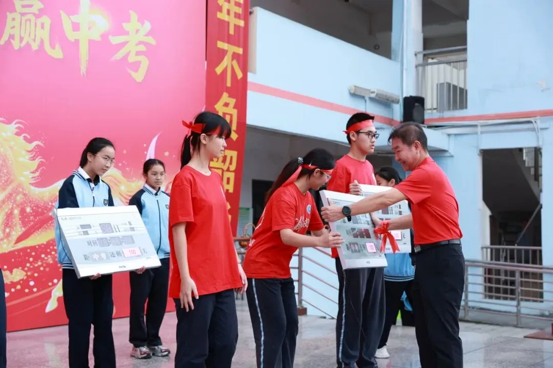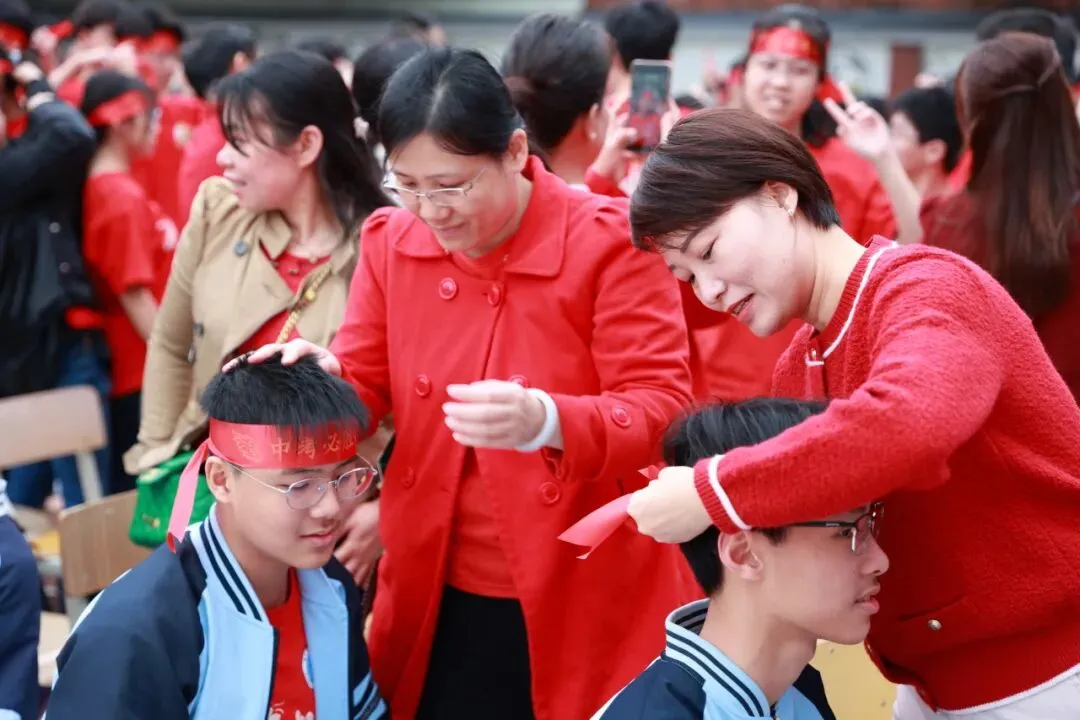 仪式环节里,九年级家长为孩子系上“中考必胜”红头绳,温情的瞬间满含期许。李斌校长与李志琴副校长共同为中考倒计时揭牌,醒目的数字让百日冲刺的使命感直击人心。九年级班级代表接授倒计时牌、年级主任及班主任接授誓师旗,鲜红的旗帜迎风展扬,励志的呼号声声铿锵,震彻校园。