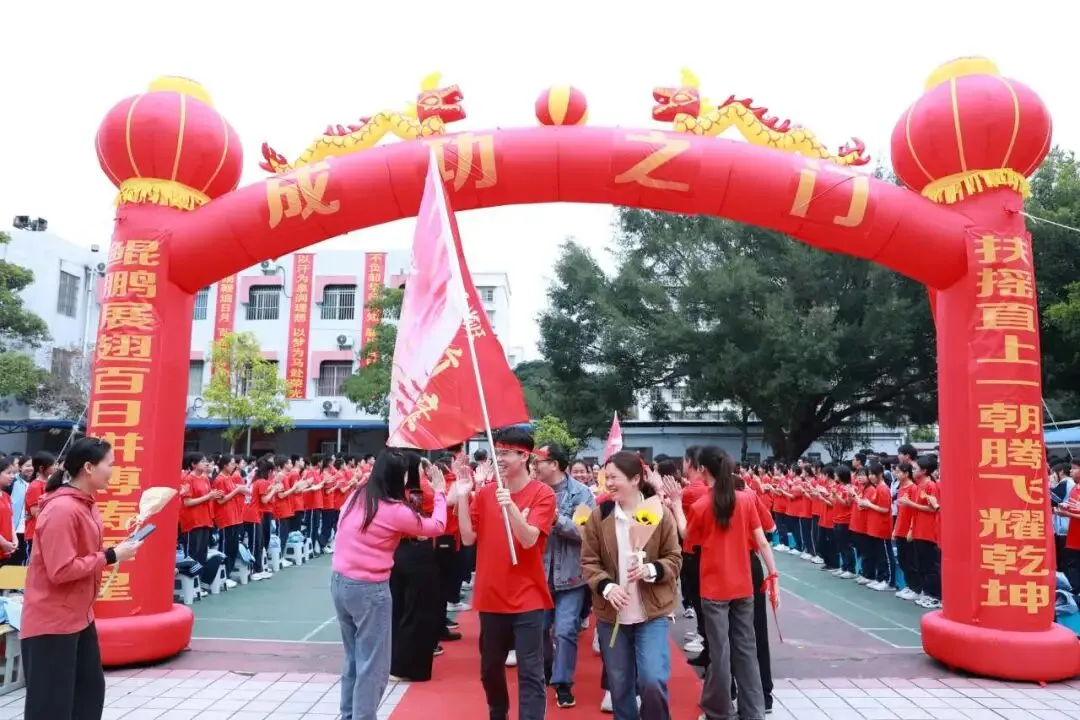 随后,班主任将誓师旗交予班级旗手,旗手们持旗绕操场奔跑,红旗招展,鼓声隆隆,全场师生齐声呐喊,为九年级阳光学子加油助威,将大会气氛推向高潮。接过寓意“高中”的发糕与粽子,带着老师们的美好祝福,九年级各班学子依次昂首走过成功门,师生击掌鼓劲,掌心相触的力量,化作前行的无限动力。