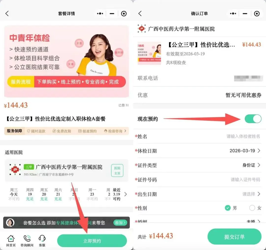 有看好的体检套餐,点击相应套餐右下角的【立即预约】,勾选【现在预约】按钮,填写体检人信息、体检日期等,提交订单并完成支付,即可完成预约。