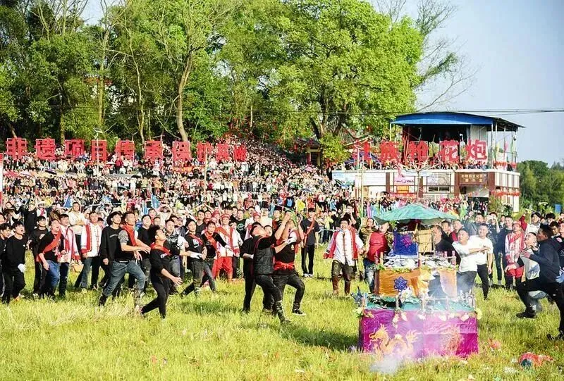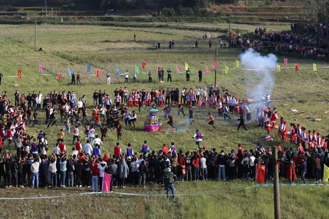 看点:三炮连放——三炮主福寿,二炮主财运,头炮主人丁兴旺!花炮腾空20-30米,众人争抢,摸爬滚打、配合掩护,被誉为“东方橄榄球”。抢到头炮者,全年鸿运当头!