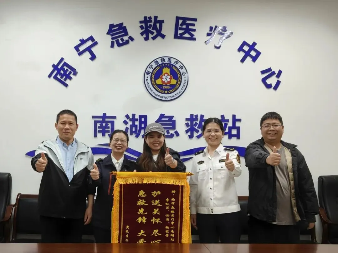 2026年3月17日上午,一位脑出血患者家属专程来到南宁120南湖急救站,将一面鲜红的锦旗送到出诊组团队手中,激动之情溢于言表。