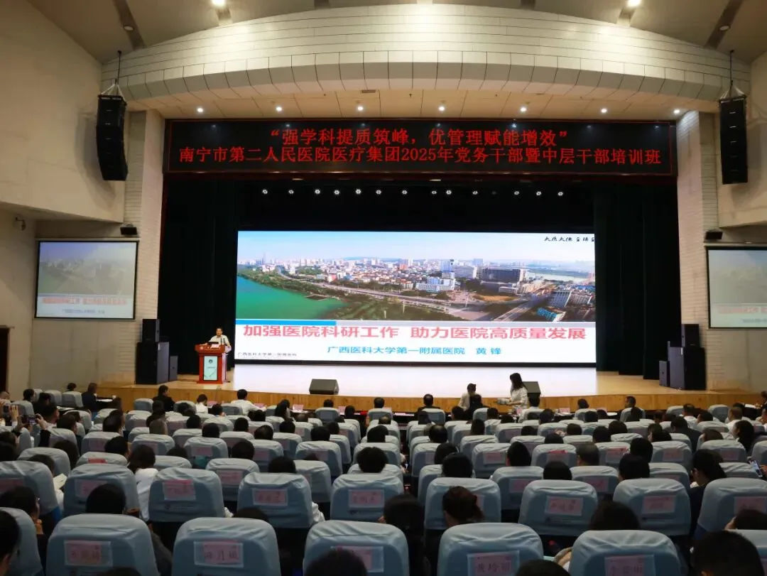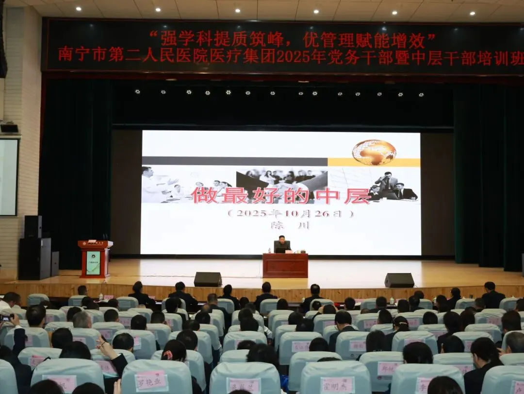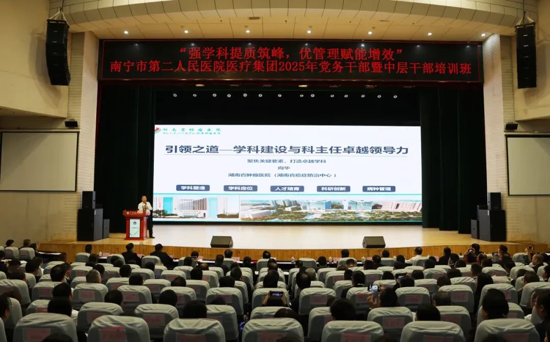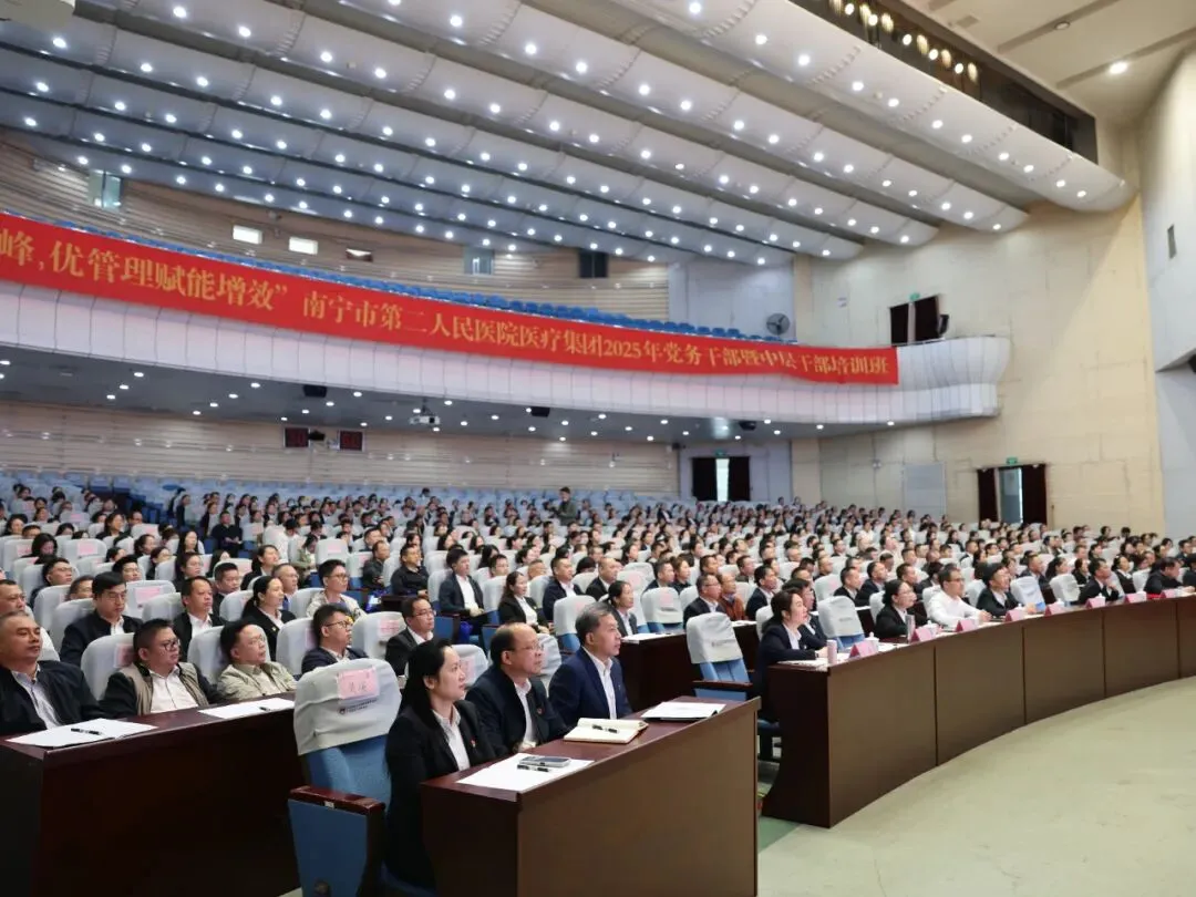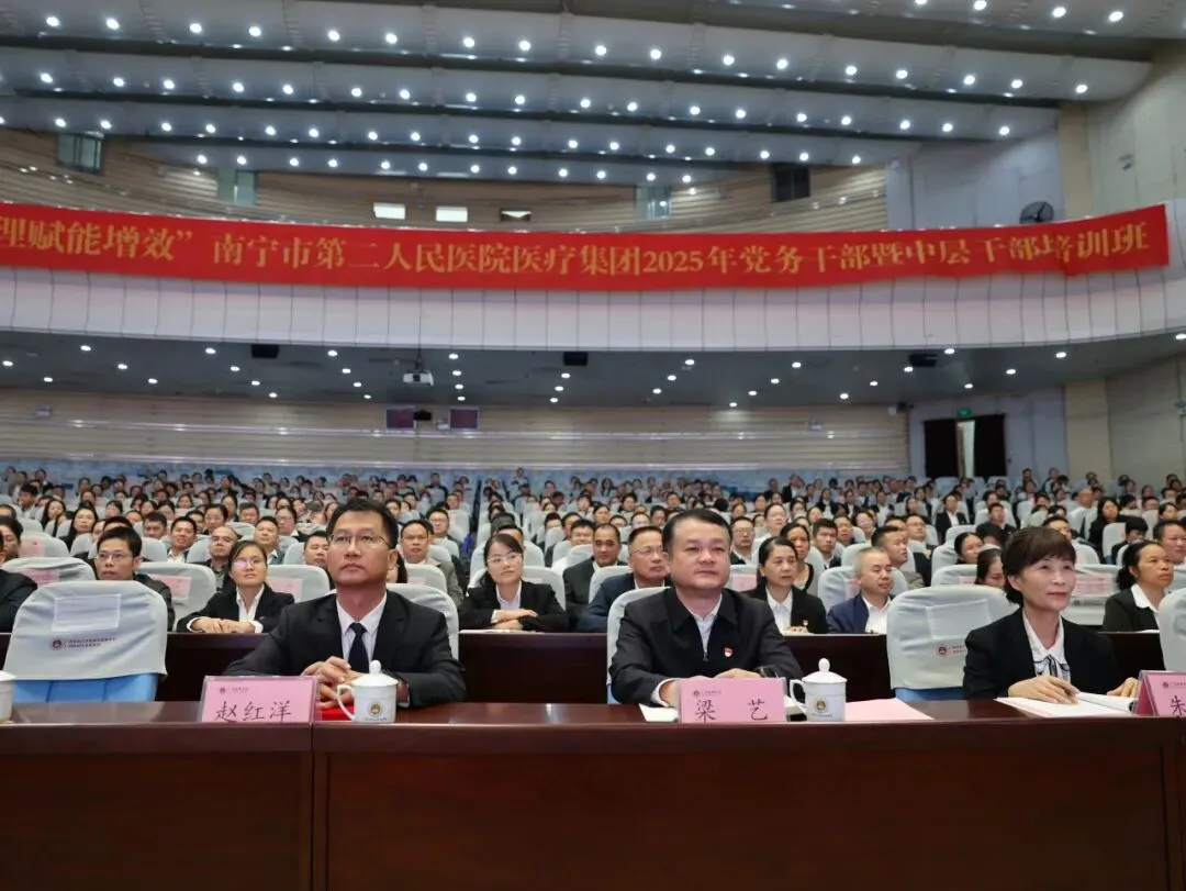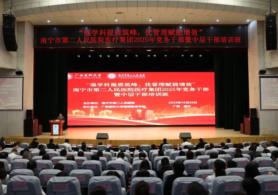 为切实加强医疗集团党务干部和中层干部队伍建设,全面提升干部队伍政治素养与管理能力,10月26日,“强学科提质筑峰 优管理赋能增效”南宁市第二人民医院医疗集团2025年党务干部暨中层干部培训班在广西医科大学校本部举行。湖南省肿瘤医院院长向华,南宁市第二人民医院党委书记赵红洋,广西医科大学继续教育学院院长周波,南宁市第二人民医院党委副书记、院长梁艺,广西医科大学继续教育学院副院长韦先良及医院其他领导班子成员参加开班仪式。医院在职党支部书记、支委、中层干部及医疗集团成员单位领导班子、党务干部和中层干部等600余人参加培训。