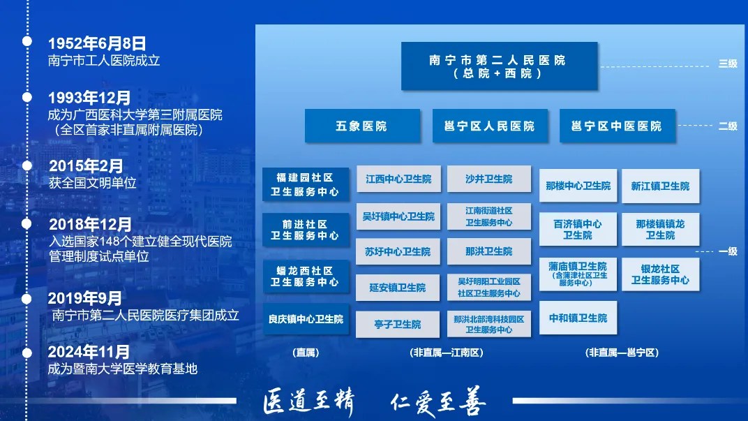 自1952年成立以来,南宁市第二人民医院先后荣获全国文明单位、全国卫生计生系统先进集体、全国青年文明号等多项国家级荣誉,2018年医院入选全国148个建立健全现代医院管理制度试点单位,成为广西4家试点医院之一。2019年,医院医疗集团成立,目前已拥有成员单位26家,形成了“核心引领 三区联动”的医疗集团新格局。