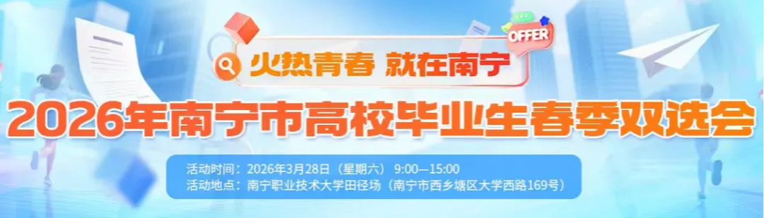 为深入贯彻中央及自治区关于高校毕业生就业工作的决策部署,进一步促进我市高校毕业生高质量充分就业。现拟定于2026年3月28日在南宁职业技术大学举办2026年“火热青春·就在南宁”高校毕业生等青年就业创业服务启动仪式暨春季双选会,现诚挚邀请广大用人单位参加!