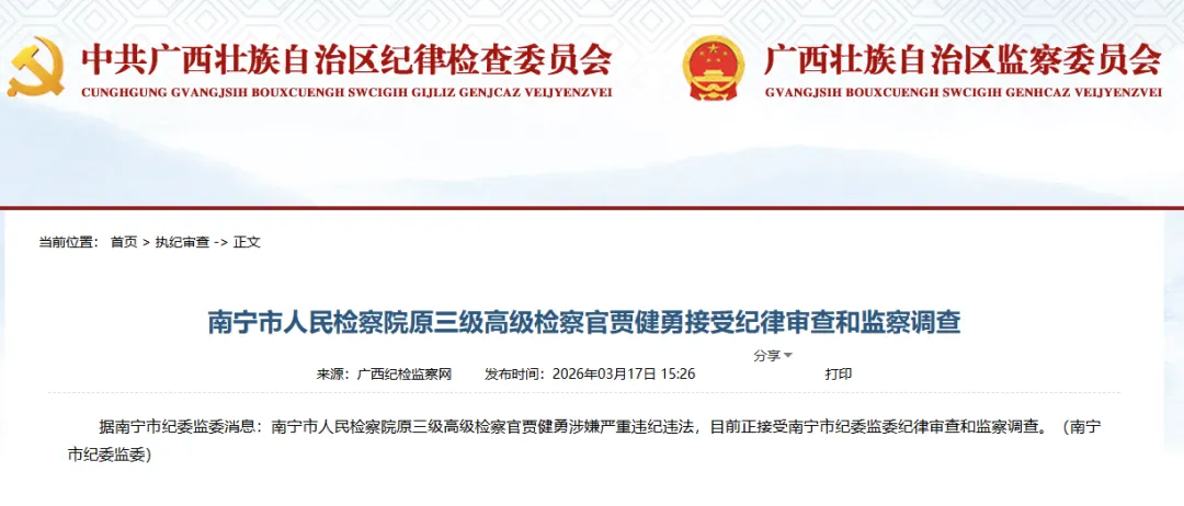据南宁市纪委监委消息:南宁市人民检察院原三级高级检察官贾健勇涉嫌严重违纪违法,目前正接受南宁市纪委监委纪律审查和监察调查。