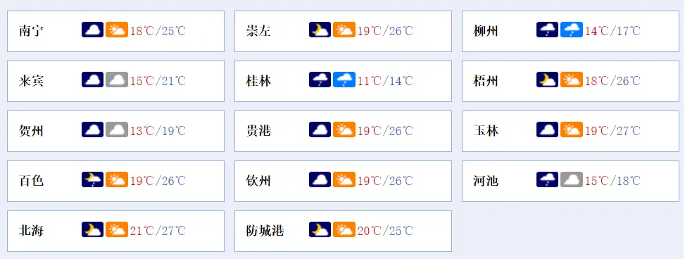 南宁市:多云到阴天、局地有小雨,偏南风2~3级,最低气温18℃,最高气温25℃。