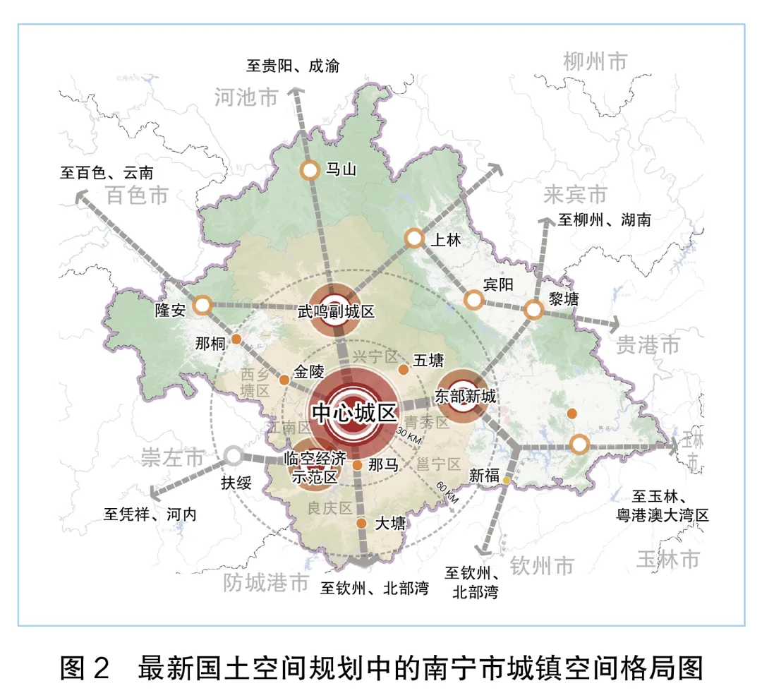 (1)需结合最新批复的国土空间总体规划,确保城轨线网规划与城镇空间布局相协调。最新批复的国土空间总体规划对城镇空间格局和发展方向做出重要调整,将原“一主四副多节点”优化为“一主三副多节点”(“一主”指南宁市中心城区,“三副”包括武鸣副城区、东部新城和临空经济示范区,如图2所示),取消南部科创新城,并收缩“重点向南”的发展策略。同时,中心城区的概念也由原来的“一主四副”收窄为主城区及临近区域范围。城轨线网规划应与新的城镇空间格局相匹配,与“一主三副多节点”的规划格局形成有效耦合。