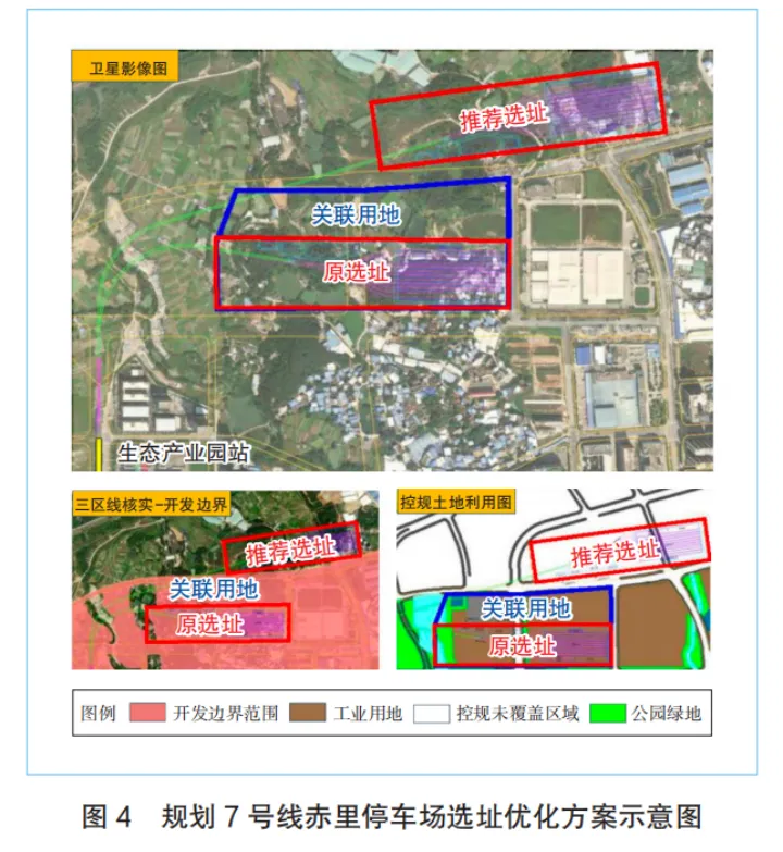 建议调整规划7号线赤里停车场的选址。赤里停车场位于西乡塘区,占地约16.64hm2,接轨生态产业园站。由于其原选址涉及用地出让,占用的建设用地规模较大,故建议北移至高安路以北、丰达路北端尽头处,如图4所示。该处位于城镇开发边界外,现状为池塘、民房和农林用地,不占用基本农田。