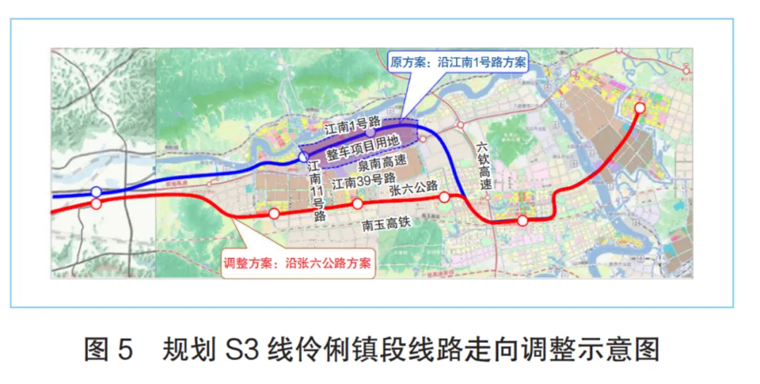 (1)建议调整规划S3线伶俐镇段(东部产业新城)线路走向。该段全长33.5km,设站2座,原规划沿江南1号路敷设,伶俐西站邻近邕江北侧产业社区(居住区)。但根据最新用地规划,江南1号路被比亚迪整车项目占用,导致道路中断,因此S3线需要在该区段重新选择线路通道。为适应由用地规划调整产生的区域核心功能布局整体南移,并提升该区域的城轨服务水平及客流吸引力,建议将线路南移,改沿张六公路敷设,如图5所示。