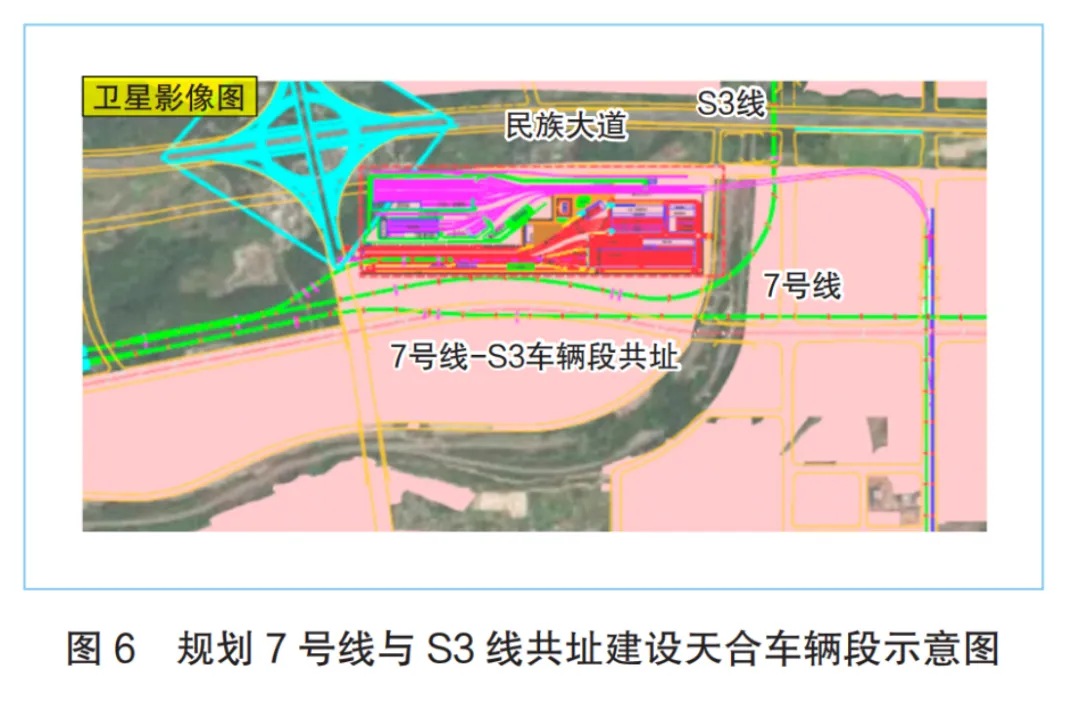 (1)建议规划7号线与S3线共址建设天合车辆段。天合车辆段位于青秀区民族大道以南,用地现状为池塘、林地,占地面积约40hm2。车辆段呈对称布置,场地规整,有利于对土地进行高效、集约利用,如图6所示。
